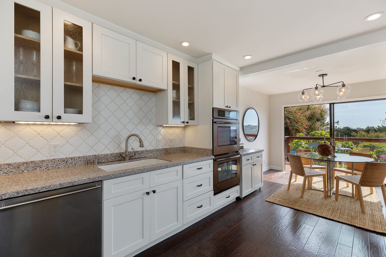 Sunnyside and Miraloma Park. Four bedrooms, two bathrooms, updated kitchen, two-car garage. Landscaped backyard with views for days to the Bay and hills to the west and south, complete with terraced planter boxes, a fig tree, tangerines, persimmons and other treats. Main level upstairs features living room with wood-burning fireplace and an open updated kitchen/dining room. Deck off of dining room gives direct access to the marvelous backyard. A skylight over the staircase ensures natural light even in the middle of the home. Two well-sized bedrooms, bath with shower over tub, and a large storage closet complete the upper floor. Downstairs are two more bedrooms, both with sliding glass doors to the backyard. Sizable two car garage with laundry and plenty of storage, plus room for two more cars in the driveway.